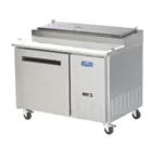 Pizza Prep Table, one-section, 47-1/2"W, 12 cu. ft. capacity, self-contained side mounted capillary tube refrigeration, electronic thermostat with digital LED temperature display, 33°F to 41°F temperature range, stainless steel top with raised refrigerated pan rail, 17-3/4"D cutting board, (6) 1/3 size clear lexan pans, (1) vaulted solid hinged self-closing door with 90° stay open feature, (1) shelf, stainless steel front & sides, white ABS interior with stainless steel floor, (4) 3" casters (2 locking), R290 Hydrocarbon refrigerant, 754 BTU/h rejected heated air gain, 1/2 HP, 5.0 amps, cord, NEMA 5-15P, cETLus, ETL-Sanitation