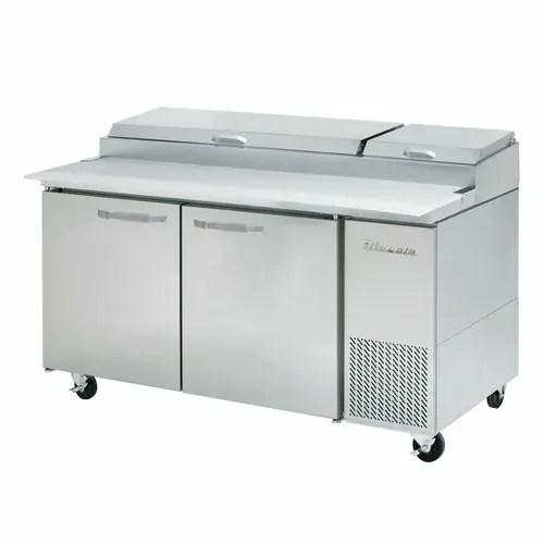 Pizza Prep Table, two-section, 67"W, 20.2 cu. ft. capacity, side-mounted self-contained refrigeration, (2) full doors, (4) adjustable wire shelves, accommodates (9) 1/3 size pans, insulated pan cover with stainless steel divider, 33°-39°F temperature range, 19"D cutting board, stainless steel interior & exterior, 4"H swivel casters (2 braked), R290 Hydrocarbon refrigerant, 3/8 HP, 115v/60/1-ph, 3.5 amps, cord, NEMA 5-15P, cUL, UL, ETL-Sanitation