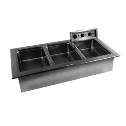 Narrow Drop-In Hot Food Well Unit, Electric, individual pan design, wet or dry type, 3-pan size for 12" x 20" pans, infinite controls, stainless steel top & inner liner, galvanized outer liner, (66-1/2" x 15" cutout required), cUL, UL, NSF
