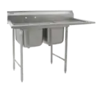 414 Series Sink, two compartment, 56-5/8"W x 27-1/2"D, 430 stainless steel top with 304 stainless steel sink bowls, coved corners, 16"W x 20" front-to-back x 13-1/2" deep compartments, 18" drainboard on left, 9-1/2"H backsplash with 1" upturn & tile edge, 8" OC splash mount faucet holes, 2" euro-style edge on front & sides, 3-1/2" basket drains with 1-1/2" outlets, galvanized legs & side crossbracing, adjustable plastic bullet feet, NSF (FLYER)