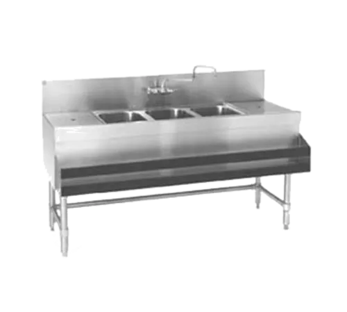 Spec-Bar® Underbar Sink Unit, 3-compartment, 48"W x 19"D x 37"H overall size, (3) 10"W x 14" front-to-back x 9-1/2" deep compartments, 12" drainboard on left with removable perforated stainless steel insert, 8"H backsplash, (1) set of splash mount faucet holes with 4" centers, includes 12" swing spout, 1-1/2" drains & removable overflow standpipes, 20/304 stainless steel construction with 16/304 stainless steel legs, side & rear crossbracing, & adjustable bullet feet, NSF