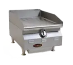RedHots® Chef's Line® Griddle, countertop, Natural gas, 15"W x 28-5/16"D x 18"H, 3/4" thick smooth fully welded polished steel griddle plate, 4"H stainless steel splash guard on rear & both sides (sloped front-to-back), stainless steel front & aluminized sides, bullnosed front edge above 45° angled manual controls, 2-3/4" grease drawer, 3-1/2"D front trough with chute, adjustable cast metal legs with flanged feet, 31,250 BTU, NSF, cULus, MADE IN USA (FLYER)