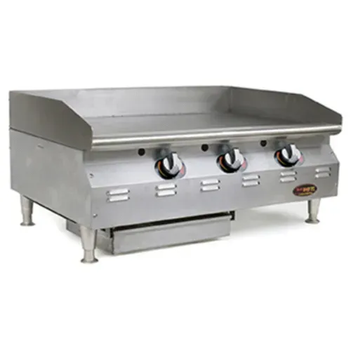 RedHots® Chef's Line® Griddle, countertop, LP gas, 24"W x 28-5/16"D x 18"H, 3/4" thick smooth fully welded polished steel griddle plate, 4"H stainless steel splash guard on rear & both sides (sloped front-to-back), stainless steel front & aluminized sides, bullnosed front edge above 45° angled manual controls, 7-1/2 quart stainless steel grease drawer, 3-1/2"D front trough with chute, adjustable cast metal legs with flanged feet, 62,500 BTU, NSF, cULus (FLYER)