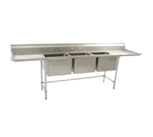 S16 Series Sink, three compartment, 115"W x 27"D, 16/304 stainless steel construction, 20" x 20" x 14" deep bowls, 24" drainboards on left & right, 8"H backsplash with 3/4" up-turn & tile edge, 8" OC splash mount faucet holes, includes (3) 3-1/2" basket drains, galvanized legs & crossbracing on side & rear, adjustable plastic bullet feet, NSF
