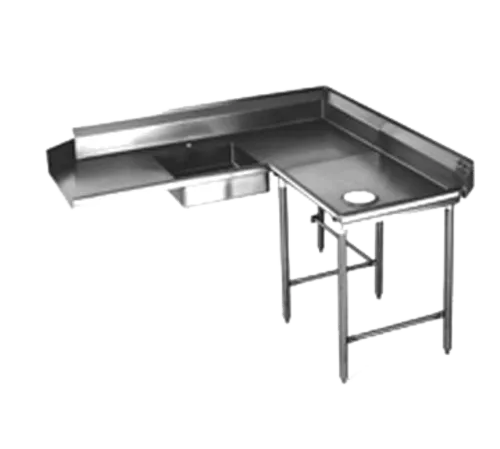 Soiled Dishtable, corner design, 84" machine to corner, 60" corner to end, 30" working depth, 43-1/2"H overall, right-to-left operation, 16/304 stainless steel top, 8"H backsplash, 20" x 20" x 5" deep pre-rinse sink with basket drain, (1) deck mount faucet hole for pre-rinse, includes scrap block, raised rolled edges on front & side, galvanized legs & side bracing, adjustable feet, NSF