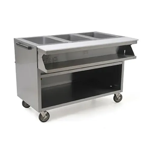 Spec-Master® Sealed Well Hot Food Table, electric, with open front, 33"W x 32-1/4"D x 35-1/2"H, wet or dry operation, (2) 12" x 20" stainless steel sealed wells, individual infinite controls, drain manifold with valve, includes removable poly cutting board, stainless steel dish shelf, 430 stainless steel construction, end panel push bar on right, 4" swivel casters (2 with brakes), 1428 watts, 208v/60/3-ph, 6.0 amps, NEMA 15-20P, NSF, cULus