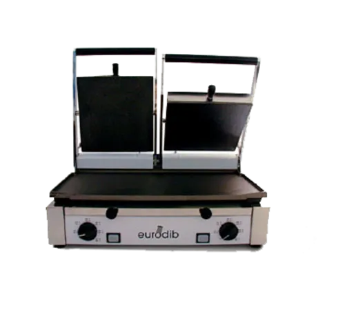 Eurodib Panini Grill, double, left side bottom flat with the remaining sides ribbed , 19.7" x 10" cast iron cooking plate, (2) adjustable thermostats up to 572°F, removable grease tray & spring cover, stainless steelconstruction, NEMA 6-20P, 208-240v/60/1-ph, 3000 watt, 15.7 amps, cETLus, UL 197 – Standard for Commercial Electric Cooking Appliances