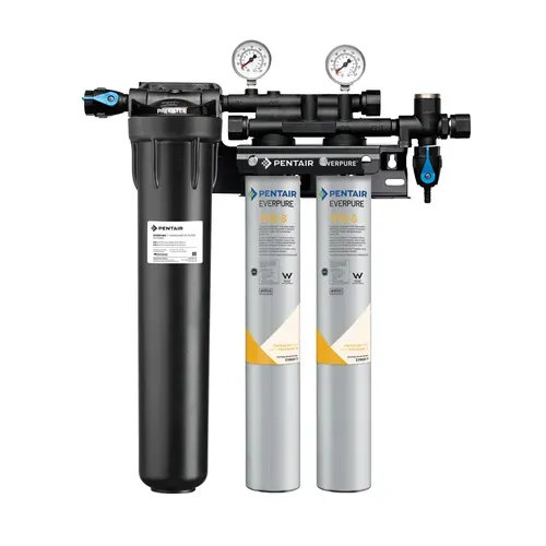 QC7I Water Filtration System, QC7I PF Twin 7FC5-S, (1) EC210 prefilter, (2) 7FC5-S Fibredyne® carbon block cartridges, reduces sediment, chlorine, taste & odor, inhibits scale, 50,000 gallons capacity, 5.0 gpm flow rate, 5 micron, inlet water shut-off valve, outlet pressure gauge, flush valve, 3/4" inlet/outlet connections, NSF 42, (EV932862)