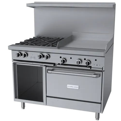 G Starfire Pro Series Restaurant Range, gas, 48", (4) 33,000 BTU open burners, cast iron top & ring grates, (1) 24" griddle, 5/8" thick smooth steel plate, (1) standard oven & (1) storage base, 3 position rack guides, (1) rack, stainless steel front, sides, plate rail, 2-piece back guard & shelf, 6" stainless steel legs, adjustable feet, 206,000 BTU, CSA Flame, CSA Star, cCSAus, NSF (Garland)
