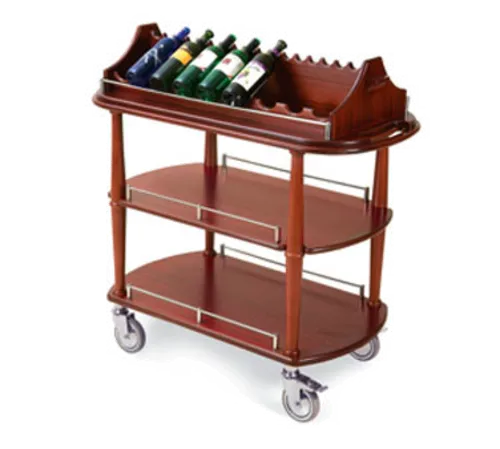 Wine Cart-Spice, 43-3/8"W x 21-5/8"D x 41-3/8"H, removable wine caddy top, hanging stemware rack, oval top with cut-out handles, (2) oval shelves, removable middle shelf, 304 stainless rails, wood veneer overlay construction with satin varnish finish, 5" chrome wheel tops, plastic core wheel with non-marking bonded rubber exterior (2 with brakes) (by Lakeside)