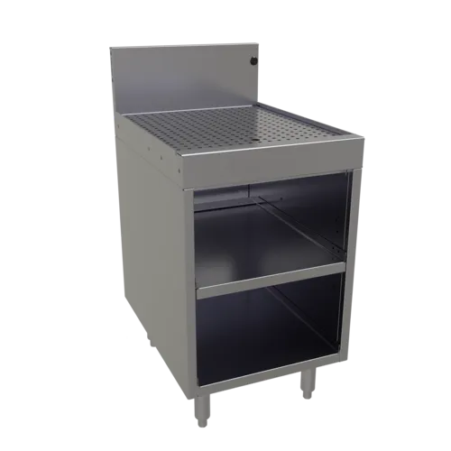 Underbar Glass Rack Storage Unit, drainboard top, 18"W x 24"D, open front base, holds (2) 16" dia. glass racks, adjustable intermediate shelf & fixed bottom shelf, drain pan with removable perforated insert & 1/2" drain, stainless steel construction, stainless steel legs with adjustable bullet feet, ETL-Sanitation