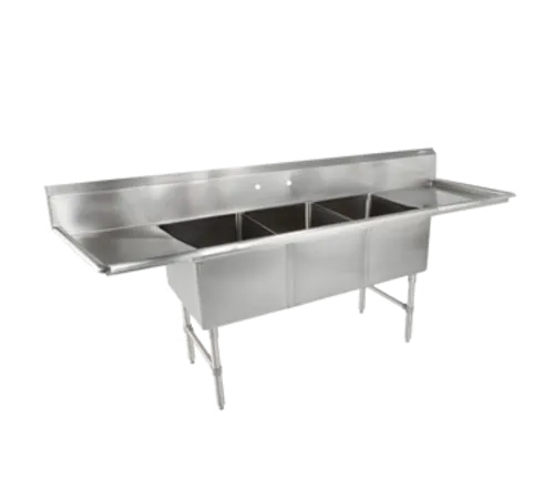 "B" Series Sink, 3-compartment, 93-1/4"W x 23-1/2"D x 44"H overall size, (3) 18"W x 18" front-to-back x 14" deep compartments, (2) 18" left & right drainboards, 10"H boxed backsplash with 45° top and 2" return, (1) set of splash mount faucet holes with 8" centers, 3-1/2" die-stamped drain openings, 16/300 stainless steel construction, stainless steel legs, adjustable side bracing, adjustable bullet feet, NSF, CSA-Sanitation