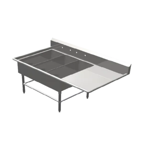 Pro-Bowl Platter Sink, 3-compartment, 64-3/16"W x 36-1/2"D x 43"H overall size, (3) 14"W x 31" front-to-back x 14" deep compartments, (1) 18" right drainboard, 10"H boxed backsplash with 45° top & 2" return, (1) set of splash mount faucet holes with 8" centers, 3-1/2" die-stamped drain openings, 14/300 stainless steel construction, stainless steel legs, adjustable front & side bracing, adjustable bullet feet, NSF, CSA-Sanitation, KD