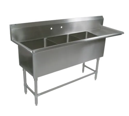 Pro-Bowl Sink, 3-compartment, 82-3/16"W x 25-1/2"D x 44-1/16"H overall size, (3) 20"W x 20" front-to-back x 12" deep compartments, (1) 18" right drainboard, 10"H boxed backsplash with 45° top & 2" return, (1) set of splash mount faucet holes with 8" centers, 3-1/2" die-stamped drain opening, 14/300 stainless steel construction, stainless steel legs, adjustable front & side bracing, adjustable bullet feet, NSF, CSA-Sanitation, KD