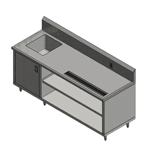 Beverage Table, cabinet base with open front, 48"W x 30"D x 45-3/4"H overall size, 14/300 stainless steel top with 10" backsplash, marine edge top, Stallion Safety Edge front and square turndown ends, (1) 18"W x 18" front-to-back x 12" deep sink on left, (1) set of splash mount faucet holes with 4" centers, 3-1/2" drain opening, hinged door in front of sink, 18" urn trough & louvered grate with 2" drain, (1) intermediate shelf, includes 1-ph duplex outlet in backsplash, 18/430 stainless steel wrap with legs & adjustable feet, NSF