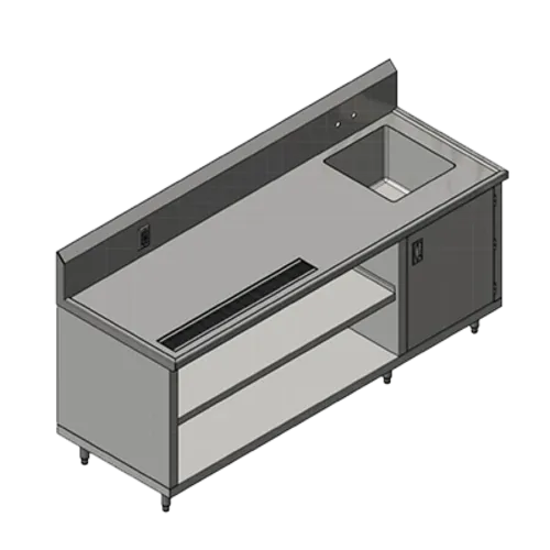 Beverage Table, cabinet base with open front, 84"W x 30"D x 45-3/4"H overall size, 14/300 stainless steel top with 10" backsplash, marine edge top, Stallion Safety Edge front and square turndown ends, (1) 18"W x 18" front-to-back x 12" deep sink on right, (1) set of splash mount faucet holes with 4" centers, 3-1/2" drain opening, hinged door in front of sink, 36" urn trough & louvered grate with 2" drain, (1) intermediate shelf, includes 1-ph duplex outlet in backsplash, 18/430 stainless steel wrap with legs & adjustable feet, NSF