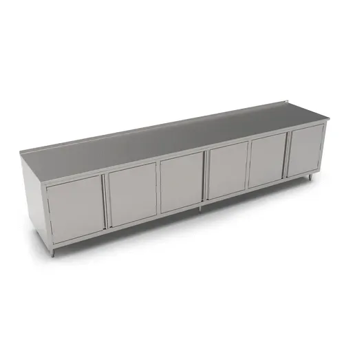 Work Table, cabinet base with (3) sets of hinged doors, 144"W x 30"D, 14/300 stainless steel top with 1-1/2" rear up-turn, Stallion Safety Edge front, 18/430 stainless steel wrap, stainless steel legs with adjustable feet, NSF