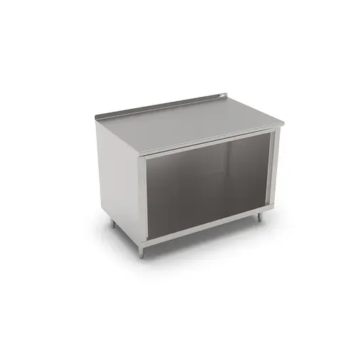 Work Table, cabinet base with open front, 36"W x 30"D, 14/300 stainless steel top with 1-1/2" rear up-turn, Stallion Safety Edge front, 18/430 stainless steel wrap, stainless steel legs with adjustable feet, NSF