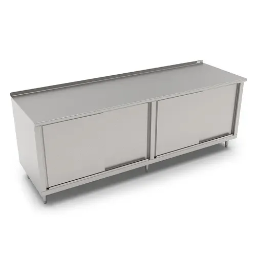 Work Table, cabinet base with sliding doors, 120"W x 36"D, 16/300 stainless steel top with 1-1/2" rear up-turn, Stallion Safety Edge front, 18/430 stainless steel body, stainless steel legs with adjustable feet, NSF