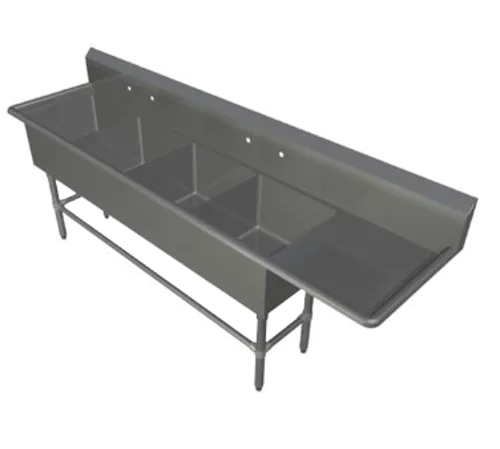 Pro-Bowl Sink, 4-compartment, 100-3/16"W x 29-1/2"D x 44-1/16"H overall size, (4) 18"W x 24" front-to-back x 12" deep compartments, (1) 24" right drainboard, 10"H boxed backsplash with 45° top & 2" return, (2) sets of splash mount faucet holes with 8" centers, 3-1/2" die-stamped drain openings, 16/300 stainless steel construction, stainless steel legs, adjustable front & side bracing, adjustable bullet feet, NSF, CSA-Sanitation, KD