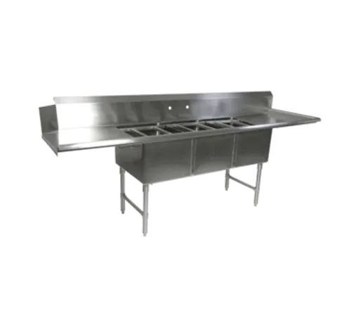 Dishtable/Pot Sinks, clean, straight design, 91-5/8"W x 30-3/8"D x 44-1/16"H overall size, (3) 18"W x 24" front-to-back x 14" deep compartments, (2) 18" drainboards, dish machine attachment on left side, 10"H boxed backsplash, (1) set of splash mount faucet holes with 8" centers, (3) rack slides with storage bracket, 16/300 stainless steel construction, stainless steel legs, bracing, & adjustable bullet feet, NSF, CSA-Sanitation (limited options available for this model) (Available in Effingham and Nevada)