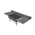 E-Series Sink, 3-compartment, 35"W x 19-1/2"D x 43-3/4"H overall size, (3) 10"W x 14" front-to-back x 10" deep compartments, 9-3/4"H boxed backsplash with 45° top and 2" return, (1) set of splash mount faucet holes with 8" centers, 3-1/2" diameter die-stamped drain openings, 18/300 stainless steel, galvanized legs & gussets, adjustable plastic bullet feet, NSF, CSA-Sanitation (Available in Effingham and Nevada)