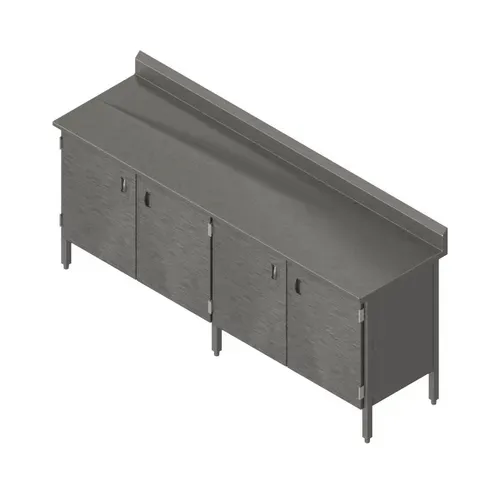 Work Table, cabinet base with hinged doors, 132"W x 30"D, 16/300 stainless steel top with 5" backsplash, Stallion Safety Edge front, 90° turndown on sides, stainless steel base, undershelf, & 1" adjustable bullet feet, all welded set-up, NSF
