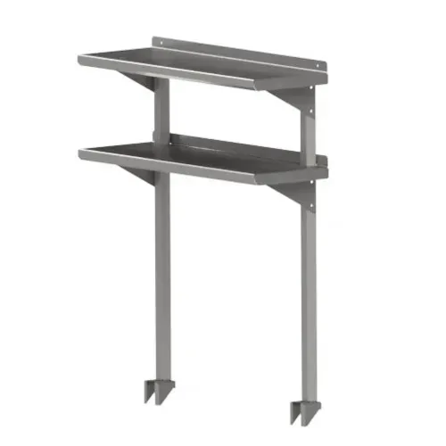 Overshelf, cantilevered, double, 120"W x 18"D, 16/300 stainless steel with 1-1/2" upturn on back, mounted 18" above table top, 12" between shelves, 1-1/2" stainless steel C-channel upright, KD, NSF