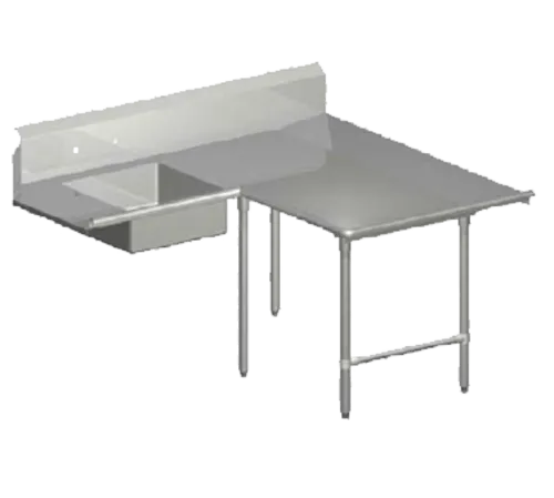 Pro-Bowl Soiled Dishtable, landing design, 70" machine to corner, 144" corner to end, 44"H overall size, L-shaped with 10" landing shelf, right-to-left operation, (1) 20"W x 20" front-to-back x 8" deep pre-rinse sink bowl, 10"H boxed backsplash with 45° top & 2" return, (1) set of splash mount faucet holes with 8" centers, 2-1/4"H rolled edge, 16/300 stainless steel top, stainless steel legs, bracing, & adjustable bullet feet, NSF