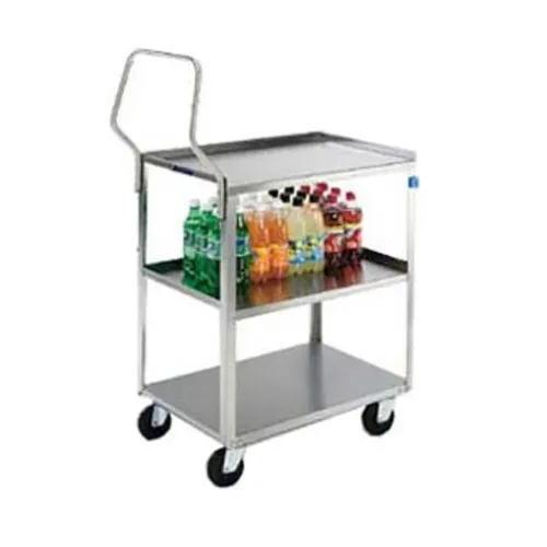 Handler™ Light Duty Utility Cart, 3-tier, open base, 300 lbs capacity, 18" x 27" shelf size, 12-1/4" shelf clearance, (1) vertical push handle, (2) bumpers on front legs, welded angle frame, stainless steel construction, 3-1/2" swivel casters, Made in USA