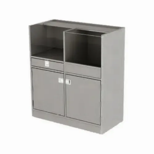 Mobile Setup Station, 48"W x 23"D x 55" O.A., (2) open compartment on top & (2) enclosed compartments on bottom with (3) sets each of adjustable universal ledges (1" increments), (2) utility drawers, upper right compartment includes space for a computer terminal & clear plexiglas top shield, stainless steel construction with 20 gauge sides & 18 gauge top, hinged doors with recessed paddle latch, (4) recessed/hidden 5" all-swivel cushion casters fastened to stainless steel dolly frame, Made in USA