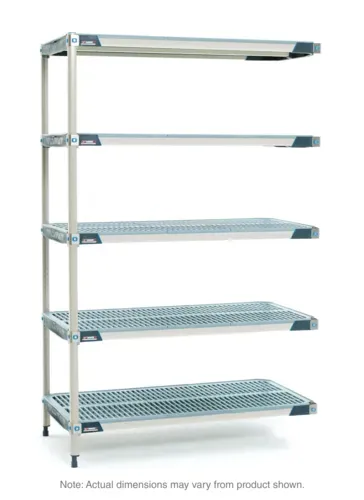 MetroMax® i Add-On Shelving Unit, 30"W x 24"D x 74"H, rust proof, 1000 lb capacity per shelf, 2000 lb. capacity per unit, includes: (5) open grid polymer shelves with reinforced type 304 stainless steel corners and removable polymer shelf mats, bag of (4) wedge connectors included with each shelf, (2) polymer posts & (10) "S"Hooks for an end-to-end configuration, Microban antimicrobial product protection, KD, NSF