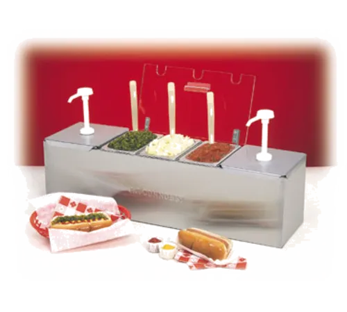 Roll-A-Grill® Condiment Station, 25.75"W x 8"D, (2) 3 qt. stainless steel pans with pumps, (1) 6.1 qt. middle pan with plastic cover with ladle cutout, dry well unit, stainless steel construction