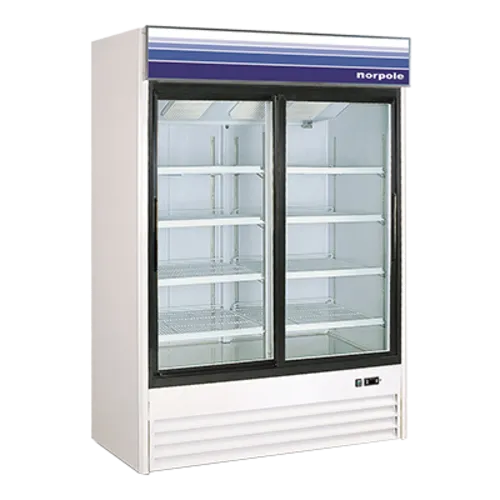 Reach-in Refrigerator, two-section, 45 cu. ft., (2) glass slide doors, mechanical temperature control, (8) adjustable shelves, interior LED lighting, heavy-duty caster wheels, white coated steel exterior, aluminum interior liner with steel floor, self-contained refrigeration, bottom mounted compressor, R290 refrigerant, 1/4+ HP, 115v/60/1-ph, 4.8 amps, NEMA 5-15P, cETLus, ETL-Sanitation