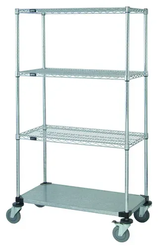 Mobile Cart, 36"W x 18"D x 69"H, includes: (3) wire shelves, (1) solid galvanized steel shelf, (4) 63"H posts, (4) donut bumpers, & (4) 5" thermoplastic resin casters (2 with brakes), chrome plated finish