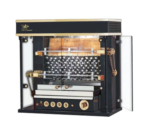 Garden Olympia MasterFlame 'Rustic-Style' Rotisserie Oven, gas, countertop, 38" W, (2) stainless steel V-shaped spits & pre-installed vertical spit system, 4-6 chicken capacity, (2) individual motors, tempered energy efficient K-Glass front and side doors, drip pan with drain plug, halogen lamp, includes decorative roof, LUX finish- full-body finish in black porcelain enamel with brass trim (chrome available with 1% surcharge, 5% surcharge for other colors from the Rotisol chart with 5 units minimum), 28,000 BTU, 0.32 kW, 208-230v/60/1-ph, 1.6 amps, cETLus, ETL-Sanitation