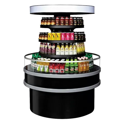 Island Display Self-Serve Refrigerated Merchandiser, 11.2 cu. ft. capacity, 48”W x 48”D x 65”H, self-contained, plug-in installation, self-cleaning condenser equipped, (3) tiers, LED interior lighting, solar powered digital thermometer, digital electronic thermostat with defrost control, ABS bump guard liners, price tag rails, black coated interior, black exterior, R290 Hydrocarbon refrigerant, 220v/60/1-ph, (4) 3/4 HP, 15.48 amps, NEMA L6-20P, cETLus, ETL Sanitation (contact sales for lead time)